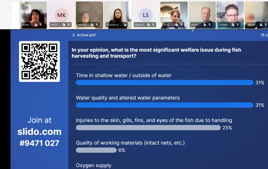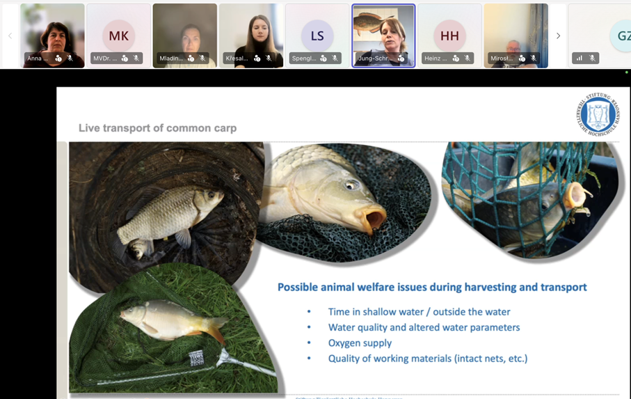 The webinar provided an overview of operational welfare indicators and assessment tools that can support official controls during the transport of common carp, linking scientific knowledge with practical implementation. The session was opened by Dr Ivona Mladineo (Biology Centre of the Czech Academy of Sciences).