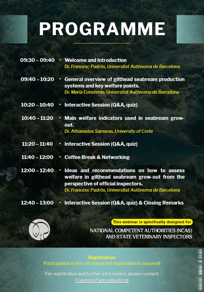 The workshop will provide an overview of gilthead seabream grow-out systems, focusing on welfare aspects and assessment methods. Participants will explore key welfare indicators and practical approaches for inspection and evaluation.