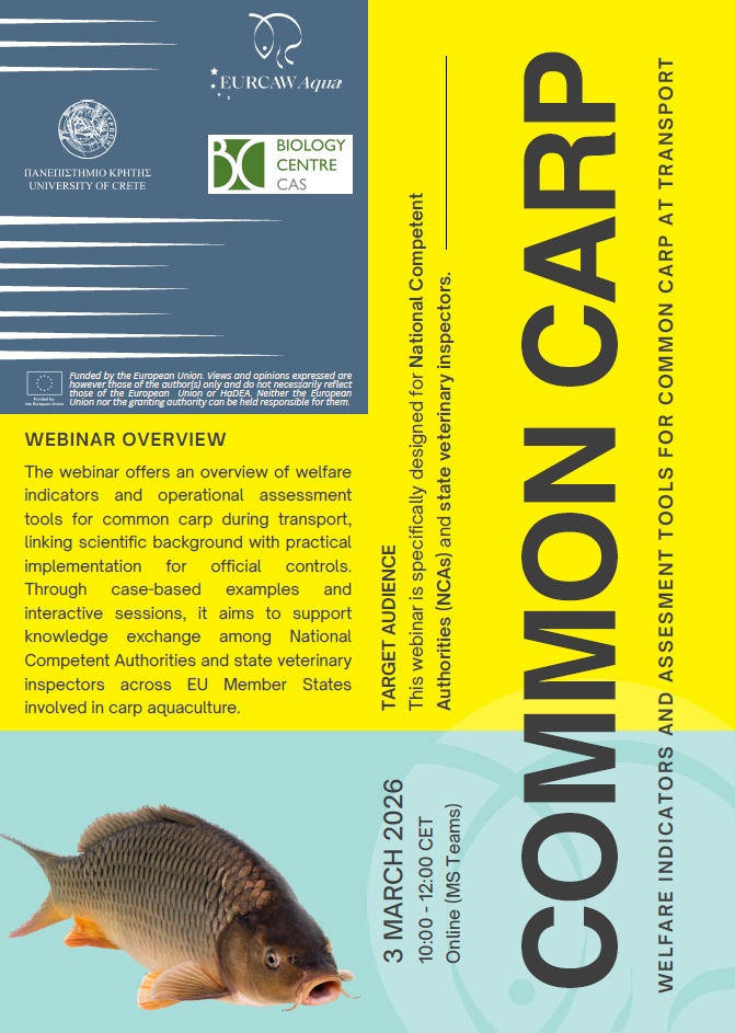 The webinar offers an overview of welfare indicators and operational assessment tools for common carp during transport, linking scientific background with practical implementation for official controls. Through case-based examples and interactive sessions, it aims to support knowledge exchange among National Competent Authorities and state veterinary inspectors across EU Member States involved in carp aquaculture.